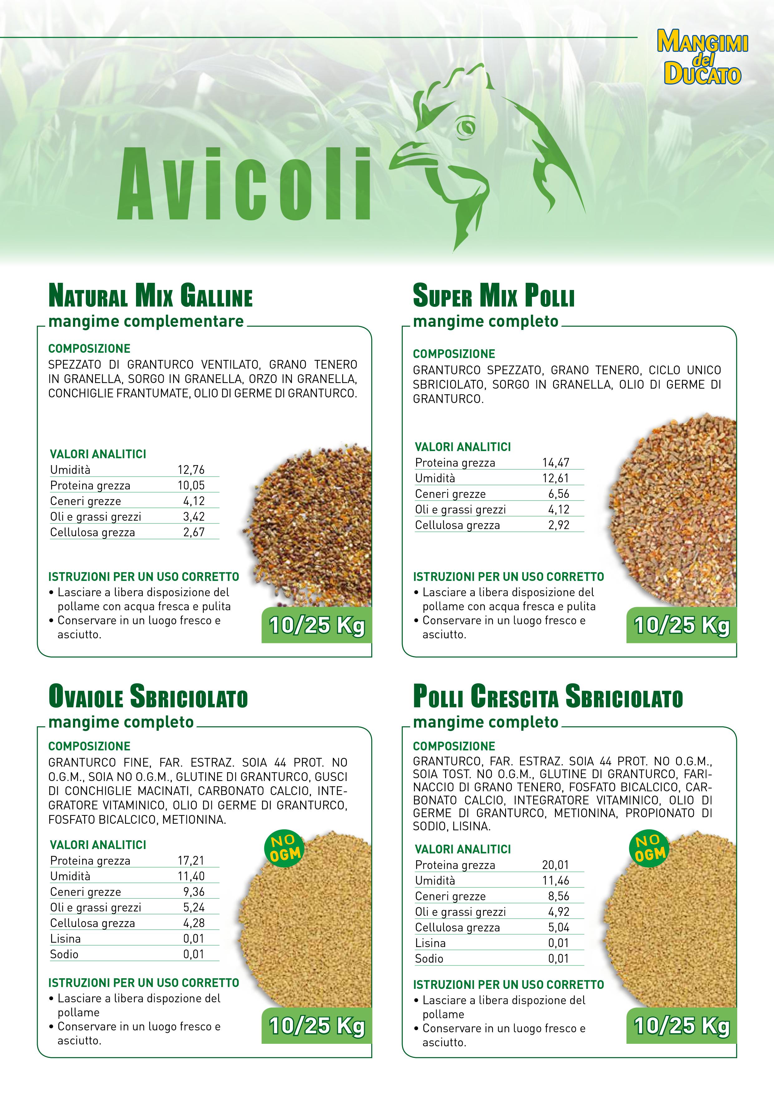 La linea di Mangimi del Ducato per avicoli comprende quattro tipi di mangimi, selezionati con le migliori materie prime.