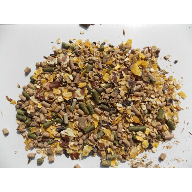 Crusca di grano tenero, granturco schiacciato, orzo schiacciato, fieno, fioccato soia, favino schiacciato, pisello schiacciato, panello di germe di granturco, avena, orzo, polpe di barbabietola, seme di lino estruso, carrube, lisina, metionina, melasso di canna da zucchero, olio di germe di granturco, erba medica, integrazione vitaminica e sali minerali.