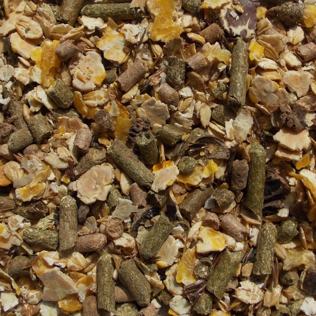 Orzo schiacciato, granturco schiacciato, erba medica, crusca grano tenero, pisello schiacciato, fieno, favino schiacciato, carrube frantumate, panello di germe di granturco, polpe di barbabietola.